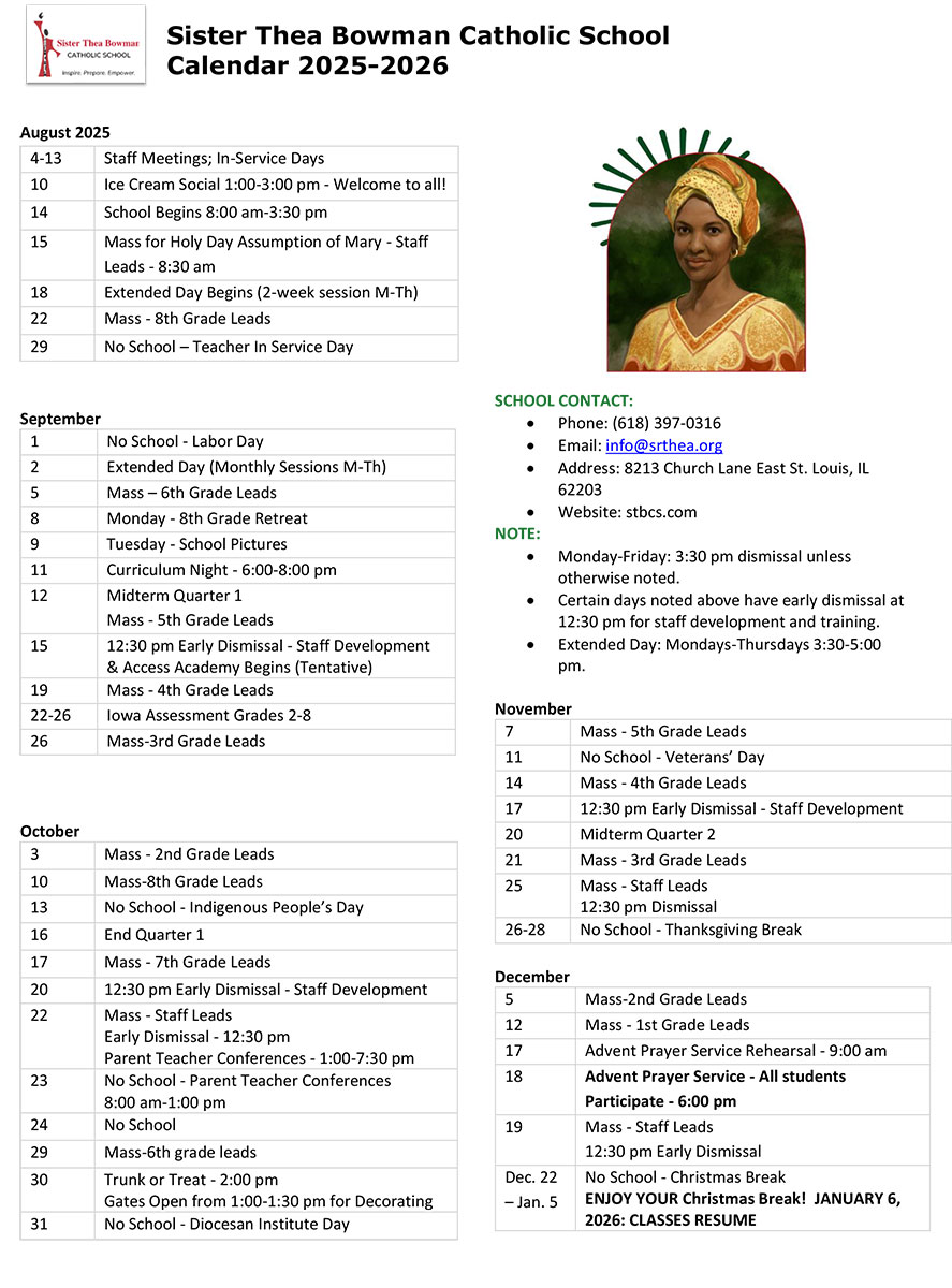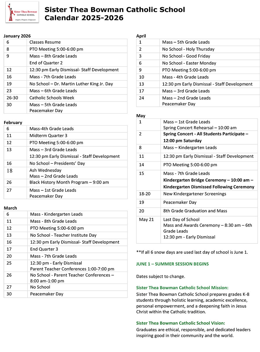 Calendar, News 2025-2026 School Calendar Updated on February 3, 2026 by SrTBowmanCS Sister Thea Bowman Catholic School Calendar 2025-2026 CLICK HERE FOR A PRINTABLE COPY