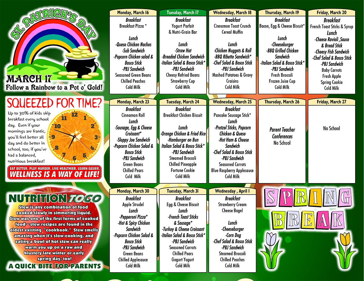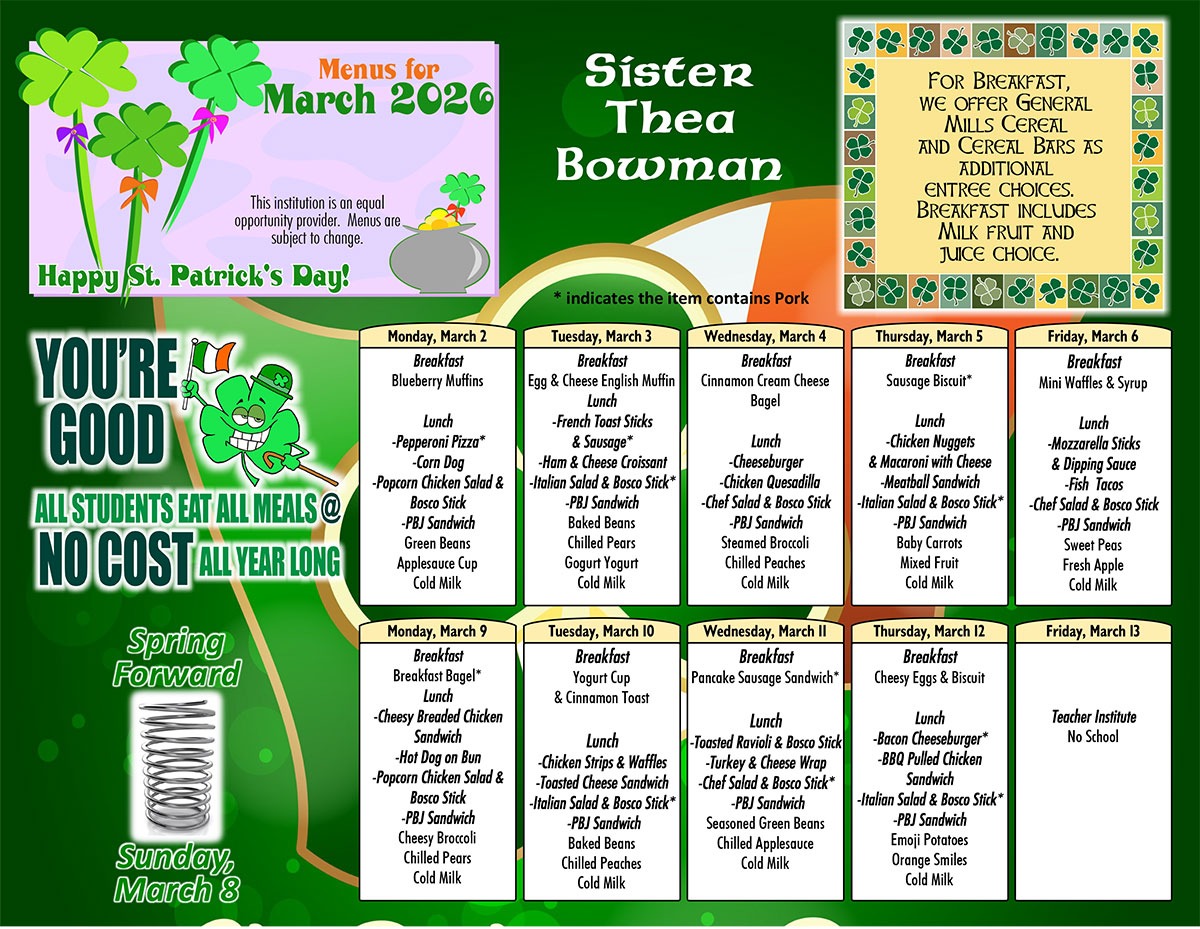Menu, News Healthy Breakfast, Lunch & Snacks Menu for March Posted on March 2, 2026 by SrTBowmanCS Here’s your Healthy Breakfast, Lunch and Snacks for March! CLICK THE IMAGES BELOW FOR PRINTABLE!