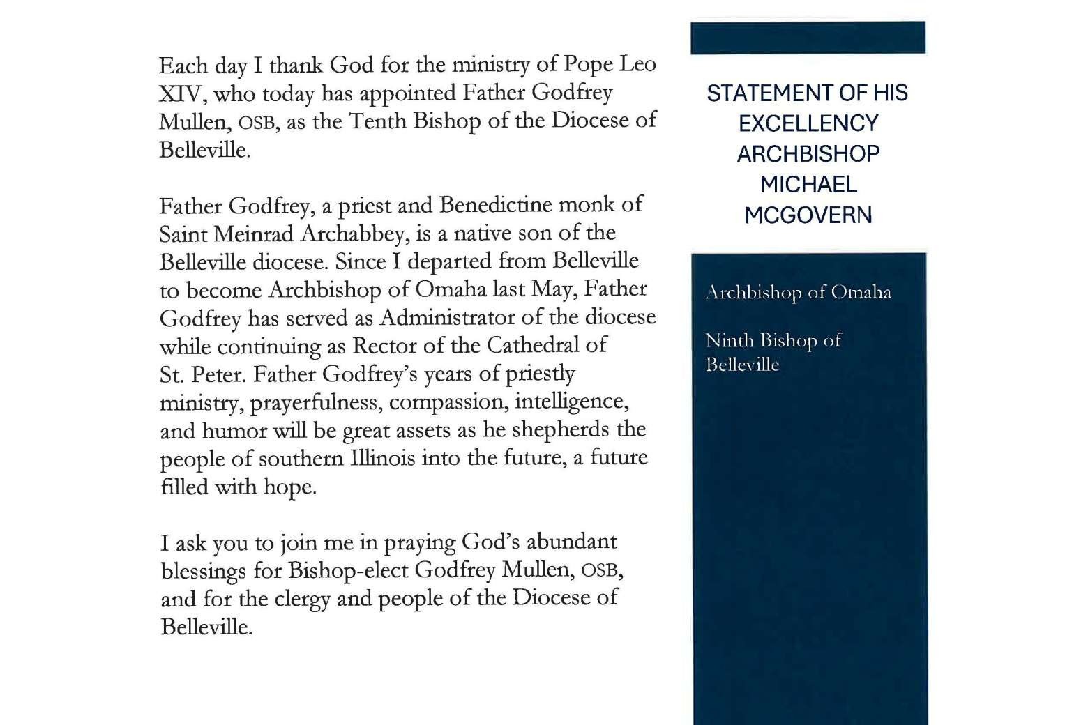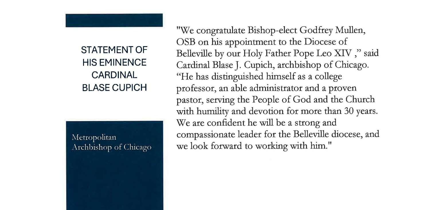 News Rev. Mullen Appointed Bishop of Belleville Posted on March 16, 2026 by SrTBowmanCS Pope Leo XIV Appoints Reverend Godfrey Mullen, OSB as Bishop of Belleville!